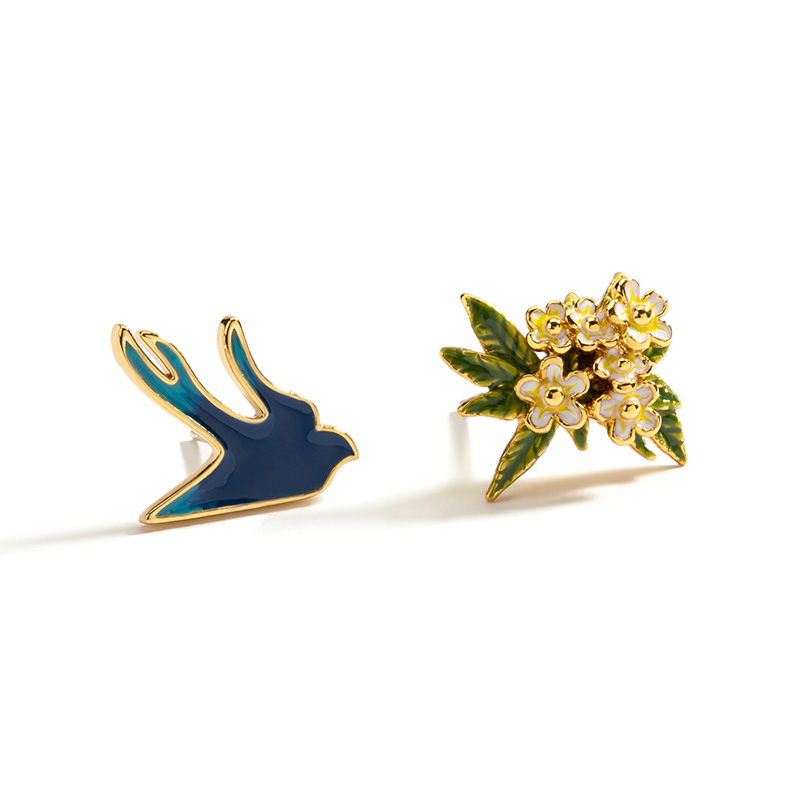 - Flower And Swallow Asymmetrical Enamel Stud Earrings