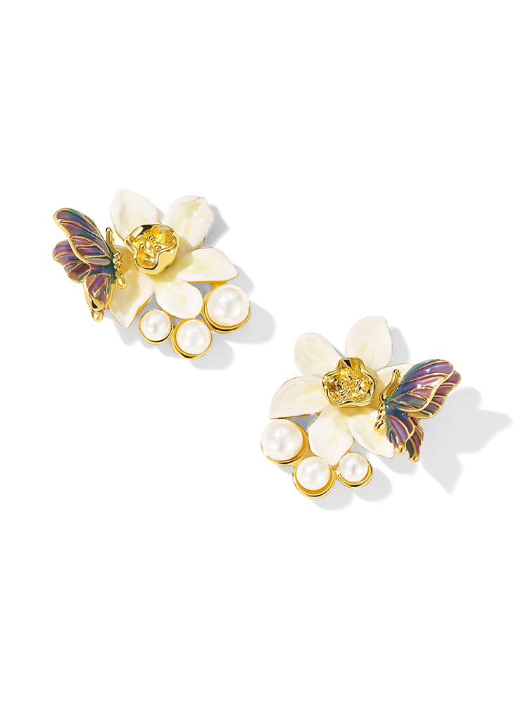 - Flower With Butterfly And Pearl Enamel Stud Earrings Jewelry Gift