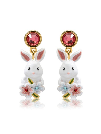 Cute Rabbit Bunny Flower And Crystal Enamel Dangle Earrings Jewelry Gift