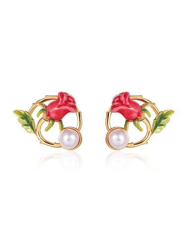 Red Rose Flower And Pearl Enamel Stud Earrings Jewelry Gift